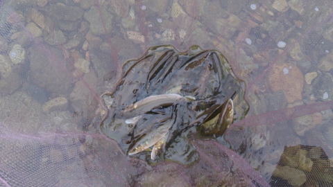 尻が空いて居ます、川へ下りてヘチを見るとブヨブヨのコケと言うか藻と言うか石にへば
